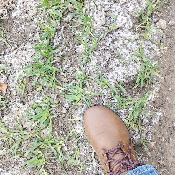 1カ月前の一番寒さが厳しい時期に「麦踏」をすることで、ガッチリとした麦となっています。麦踏は、麦が3~4葉期を迎える1月上旬から2月中下旬にかけての厳寒期に行います。茎が立ち上がる前(節間が伸びる前)までに、土が乾いた晴れの日を選んで2~3回程度実施し、根の張りや分けつを促進します。霜柱で浮き上がった根を土に戻し、過剰な生育を抑え、寒さや乾燥、風による倒伏を防ぐ効果があります。特に冬の間の健康な成長を促し、収穫量を増やすための重要な管理作業です。