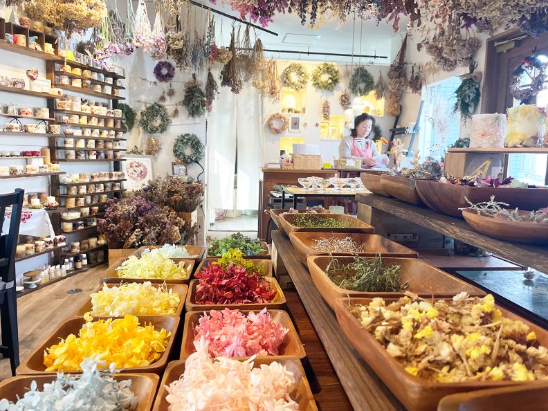 店長の田中律子さんは、小学校の教員を退職後、6年前に花を生かしたキャンドルの店をオープンした。コロナ下で花の行き場が失われていく状況に胸を痛めたことがきっかけだった。知り合った花農家から、切り花として出荷できない花などを買い取り、ドライフラワーに加工する。