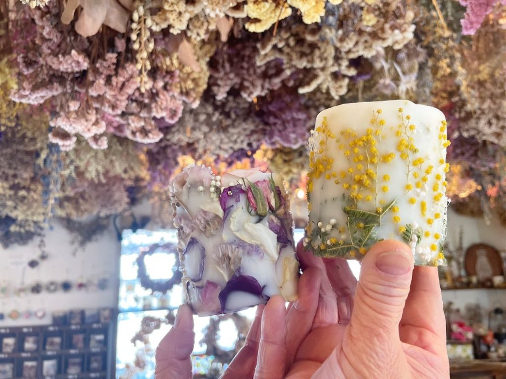 店内ではキャンドル作り体験もできる。自分で選んだドライフラワーなどを容器に詰め、溶かした蜜ろうを流し込む。冷やし固めた後、型から外して仕上げの加工をすると、花の色や形が立体的に浮かび上がったキャンドルが完成する。田中さんは「こんなふうに仕上がった、とお客さんと一緒にいつも感動します」と笑顔を見せる。