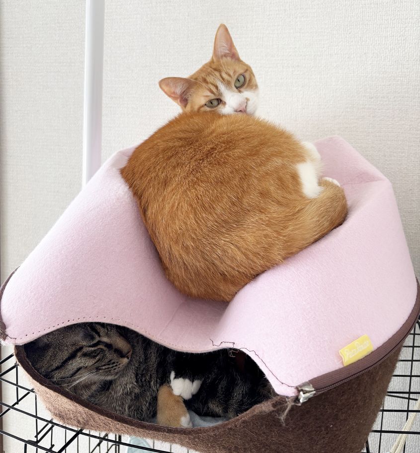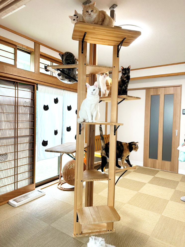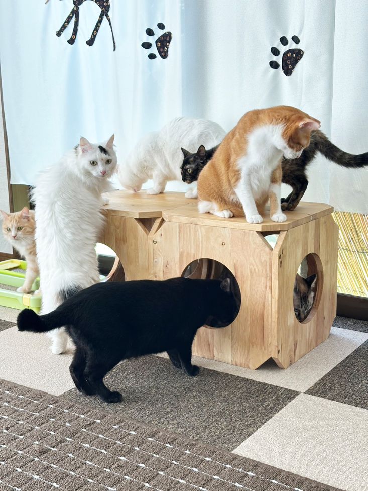 清潔感のある猫部屋では、「専属ニャンズ」9匹を含めた12匹がお出迎え。窓辺でぬくぬくと日向ぼっこしたり、キャットタワーを元気に上り下りしたりと、思い思いに過ごす姿が、訪れる人を和ませる。猫と思う存分過ごせる、まさに「幸せの空間」だ。