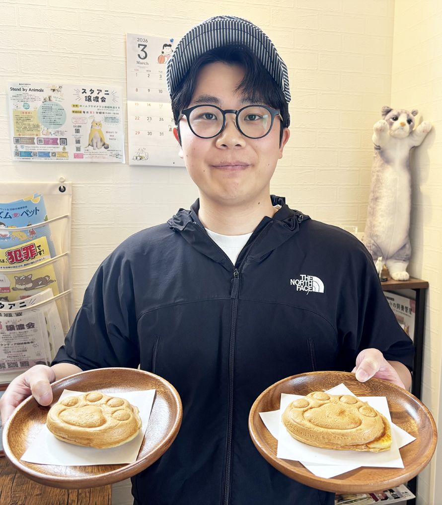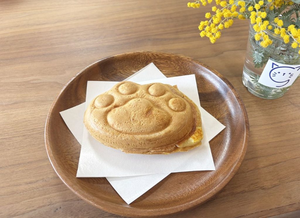 カフェスペースでは、肉球型の「ねこの手たい焼き」を販売。オリジナルの型で焼き上げ、外は香ばしく中はもっちり。黒あんやカスタードなど5種類の味が楽しめる。店内のハンドメイドコーナーには、猫モチーフのアクセサリーや雑貨がずらりと並ぶ。