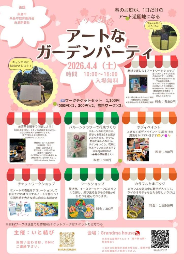 「汚れてもいい格好で来てください」-。生の音楽と自然の中で、子どもたちが思い切りアート体験を楽しめるイベント「アートなガーデンパーティ」(いと結び主催)が4月4日、糸島市志摩、櫻井神社隣のレンタルスペース「Grandma house(グランマ・ハウス)」で開かれる=写真はチラシ。
