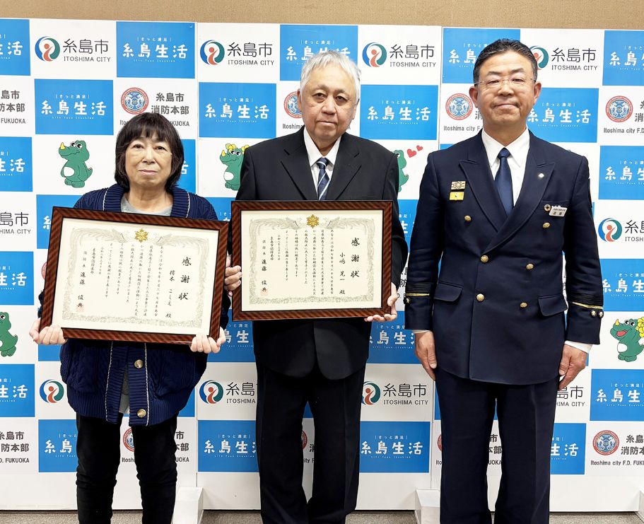 糸島市消防本部(進藤俊典消防長)は、建物火災の初期消火に協力し延焼拡大を防いだとして、同市前原駅南の樗木こしえさん(72)と小嶋晃一さん(62)、山下直樹さん(76)、政子さん(78)夫婦に感謝状を贈った。樗木さんと小嶋さんは3月17日に、山下さん夫妻は同27日にそれぞれ表彰された。