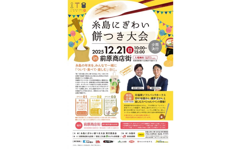 21日 みんなで餅をついてまちのにぎわいを盛り上げよう-。地場企業や商店街が力を合わせて企画した「糸島にぎわい餅つき大会」(同実行委員会主催)が21日、糸島市の前原商店街・名店街エリアで開かれる=写真はチラシ。 会場の一部は歩行者天国とな... -